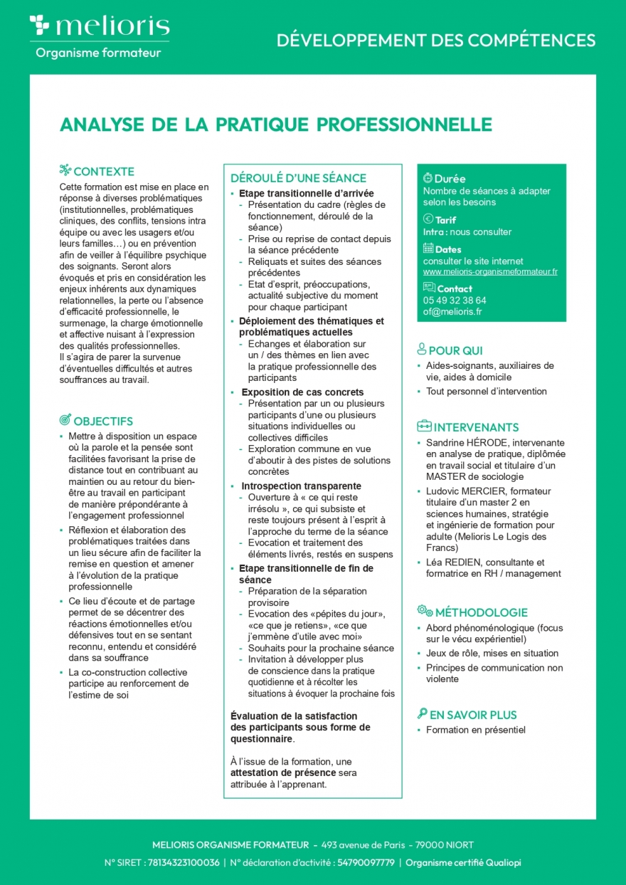 - Réflexion et élaboration des problématiques traitées dans un lieu sécure afin de faciliter la remise en question et amener à l'évolution de la pratique professionnelle